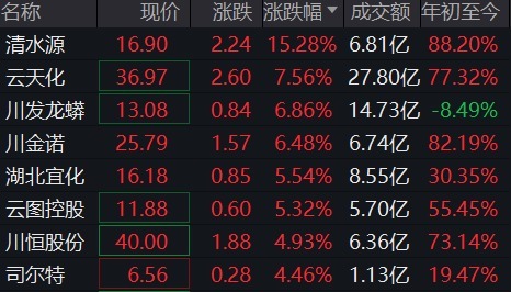 | 磷化工板块延续强势表现,截至发稿清水源涨超15%,云天化涨超7%,川发龙蟒、川金诺涨超6%,湖北宜化、云图控股涨超5%。